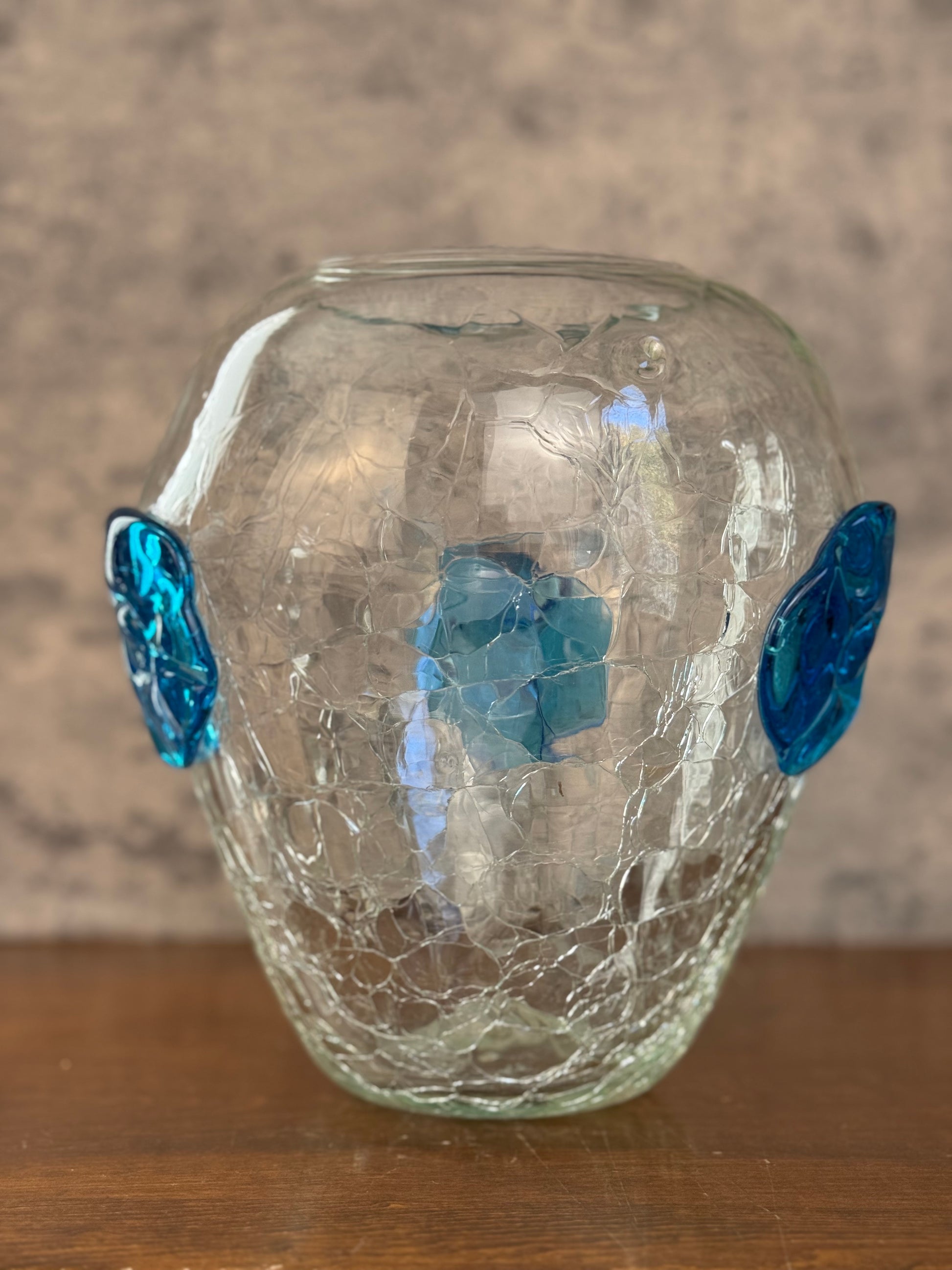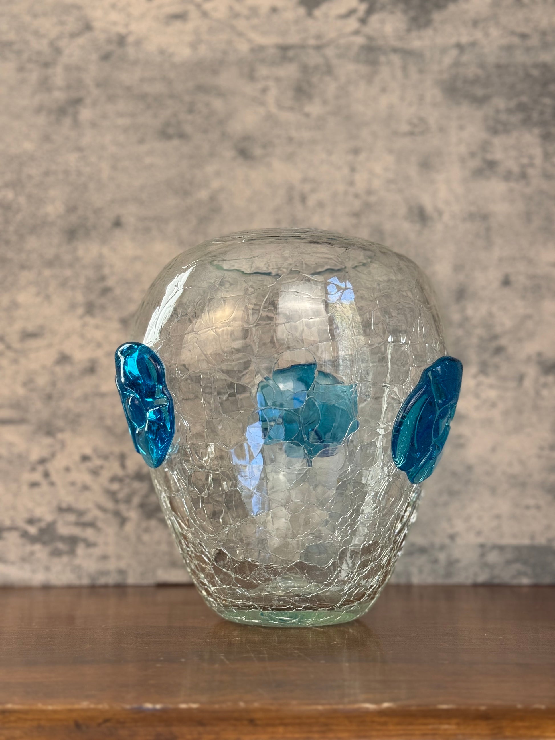 Blenko Crackle Glass Vase with Blue Flowers (1950's)
