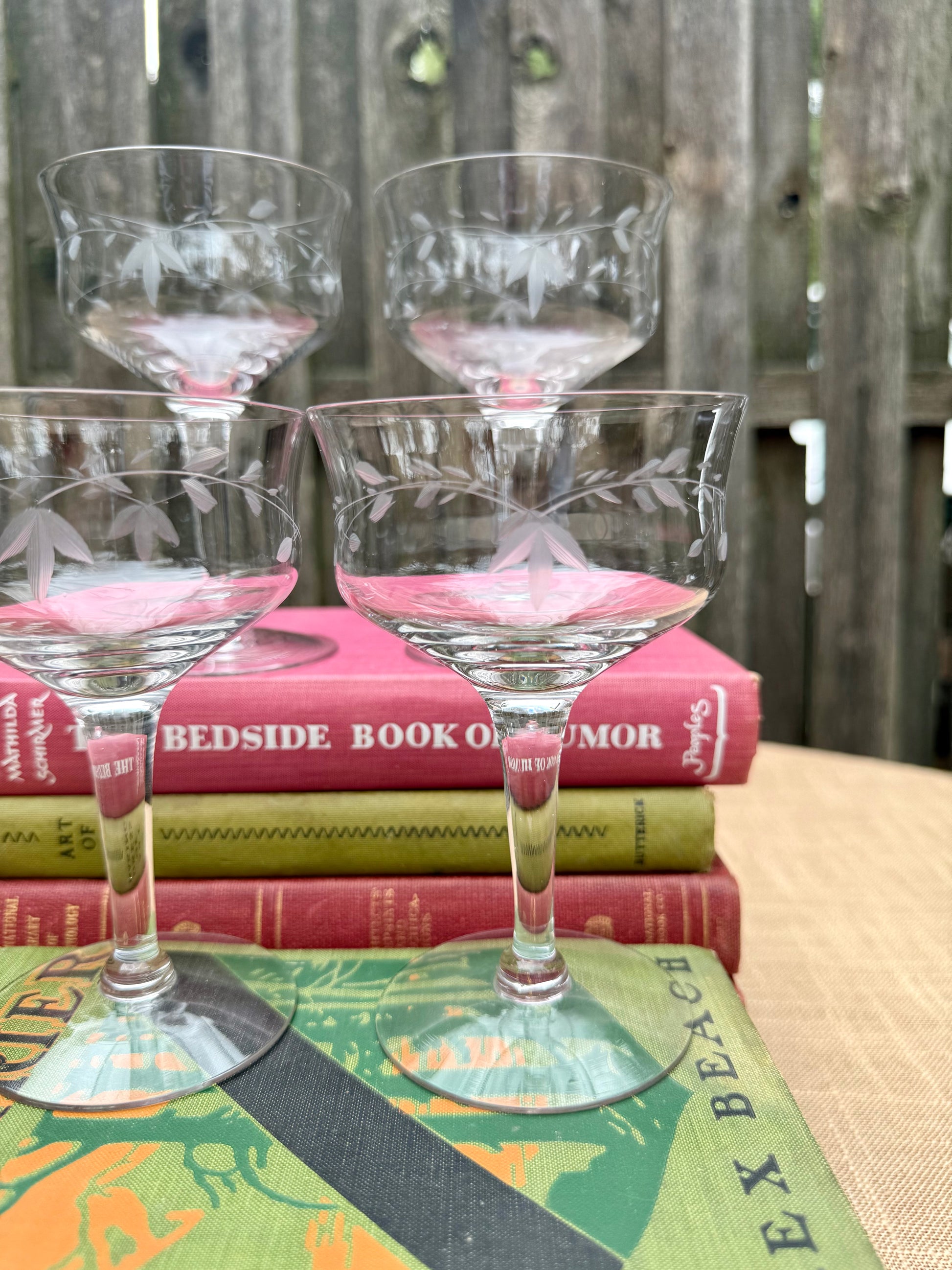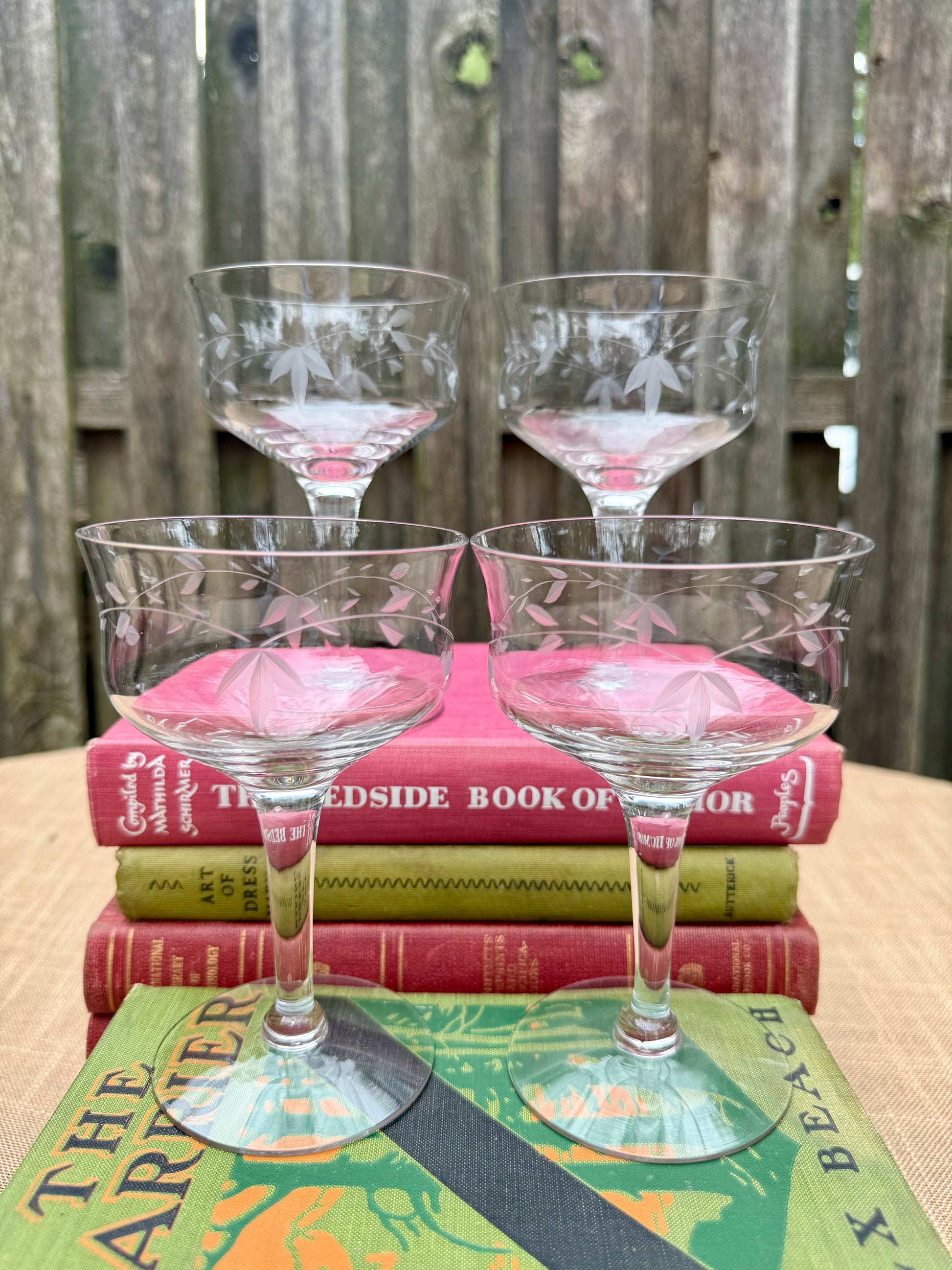 Leaf & Vine Etched Glass Cocktail Coupes, Set of 4 (1970's-1980's)