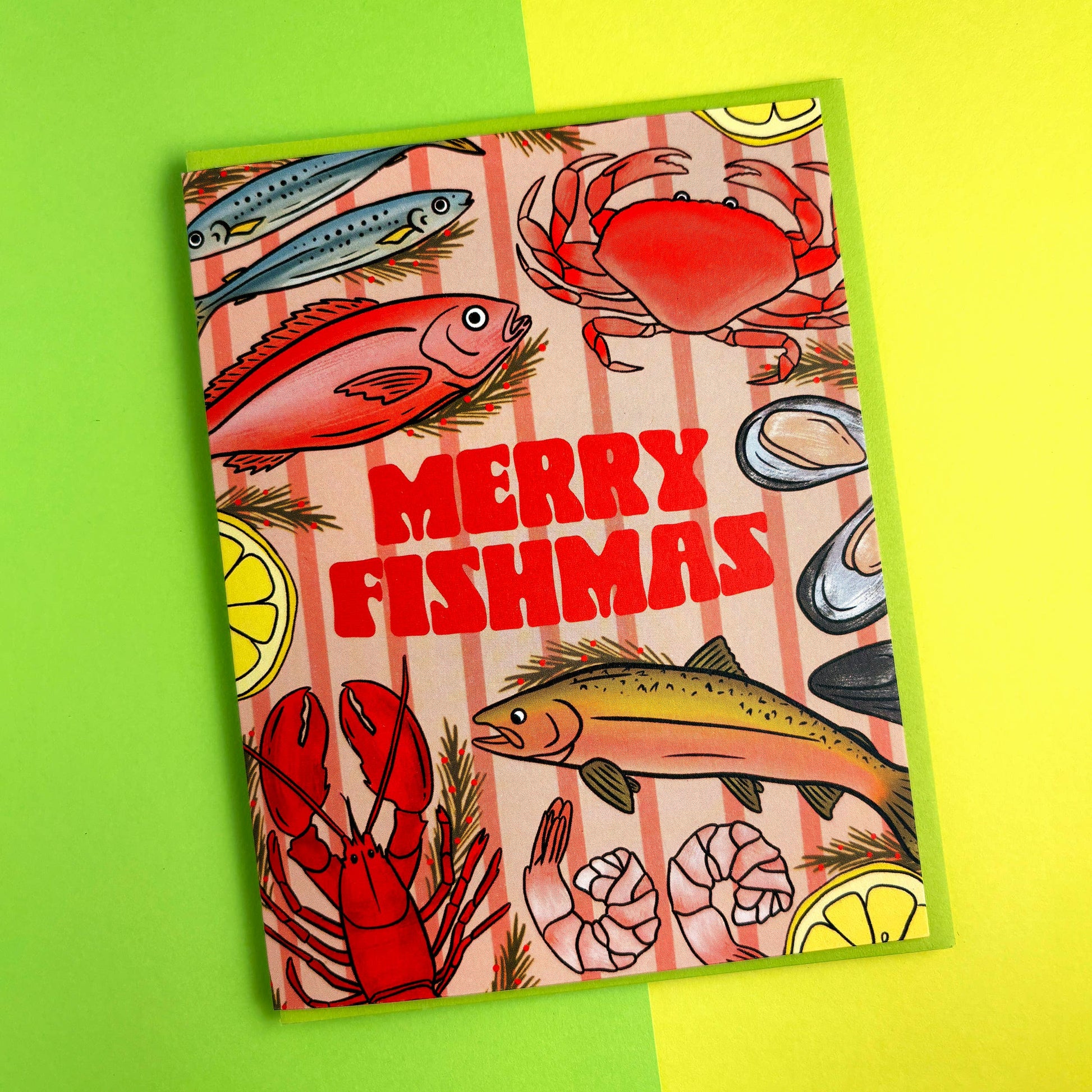 A festive tribute to the Feast of the Seven Fishes, this playful holiday card features a vibrantly illustrated spread that's perfect for seafood lovers. This holiday card reads "Merry Fishmas" and features an illustrated spread of seven fishes including shrimp, mussels, lobster, crab, sardines and more against a coral striped backdrop.