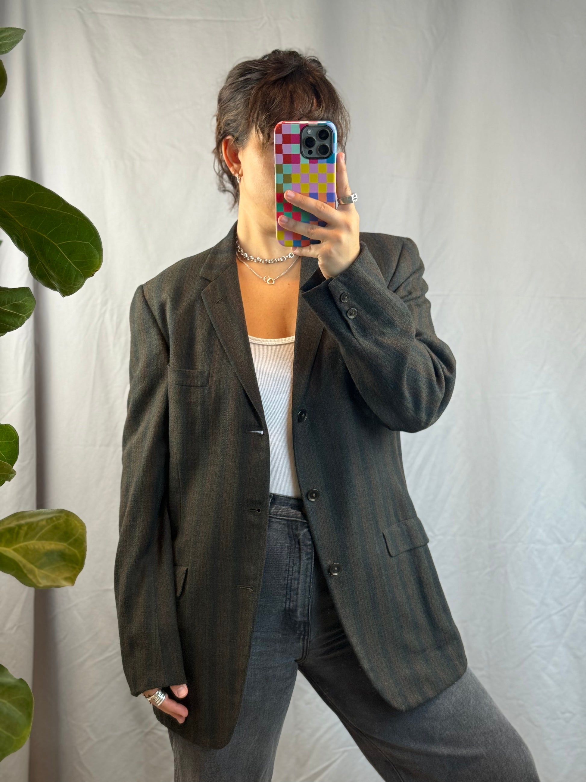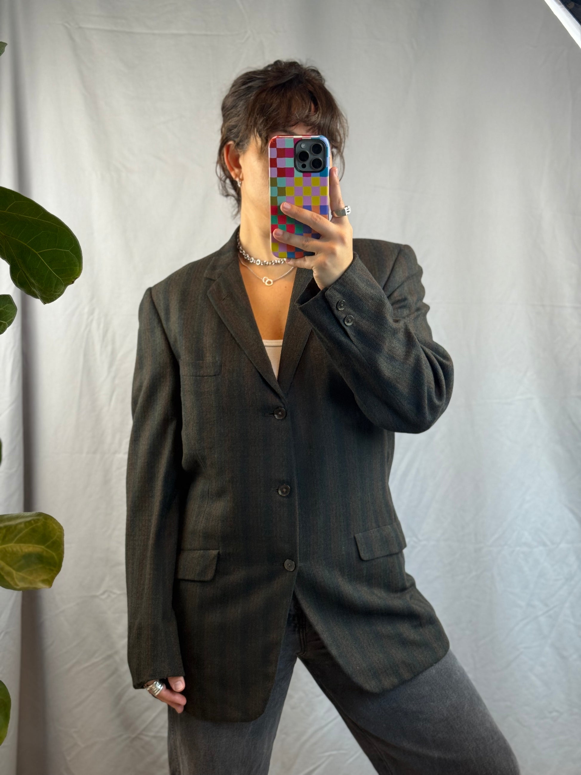 | Notes | Single-breasted, 3-button front closure, 2 front flap pockets, pocket square holder, 2 interior pockets, partially lined, shoulder padding |